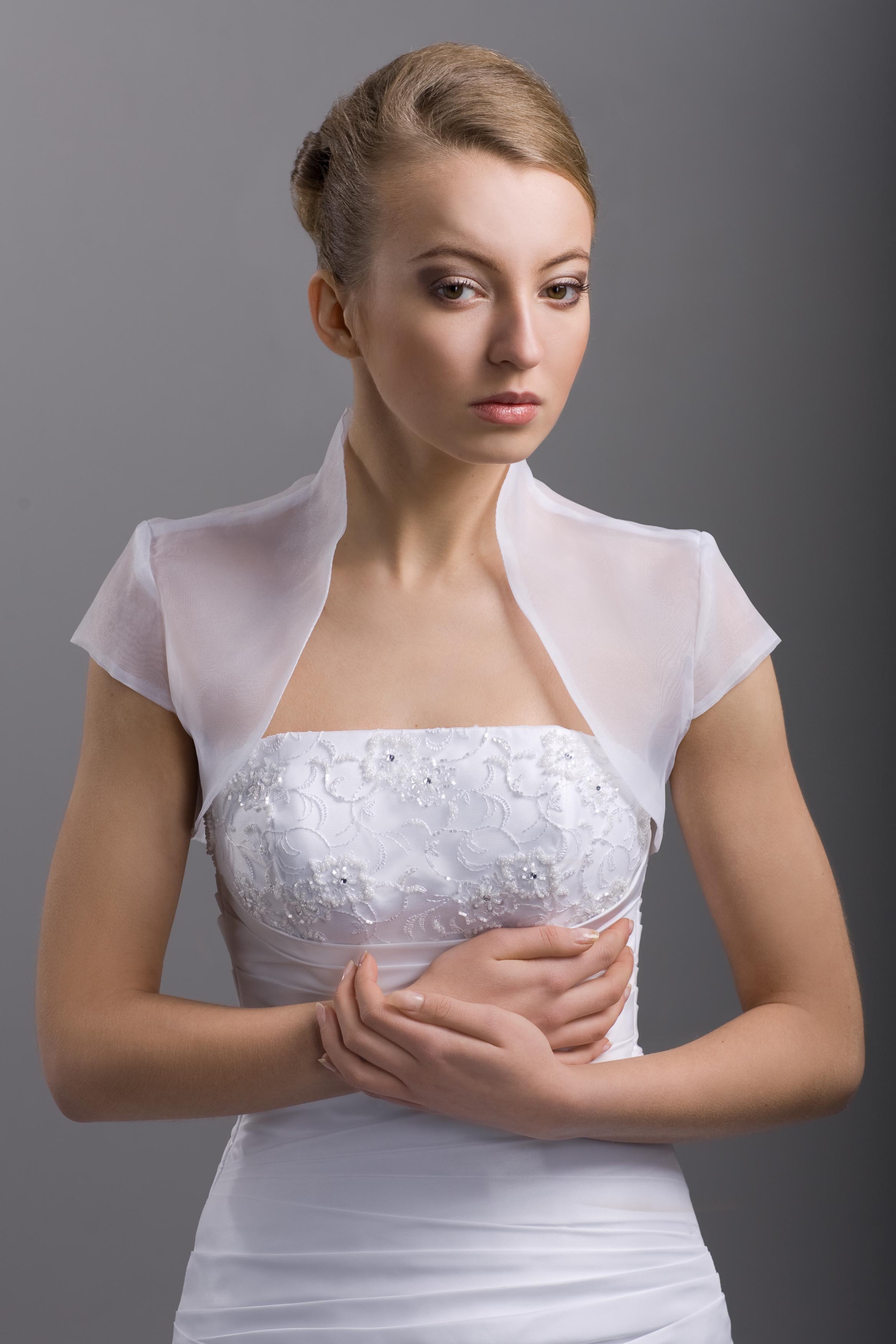 Superbe boléro de mariée manche courte Organza Disponible en blanc, noire et ivoire. Deux tailles disponibles : S,M,L,XL,XXL,XXXL.