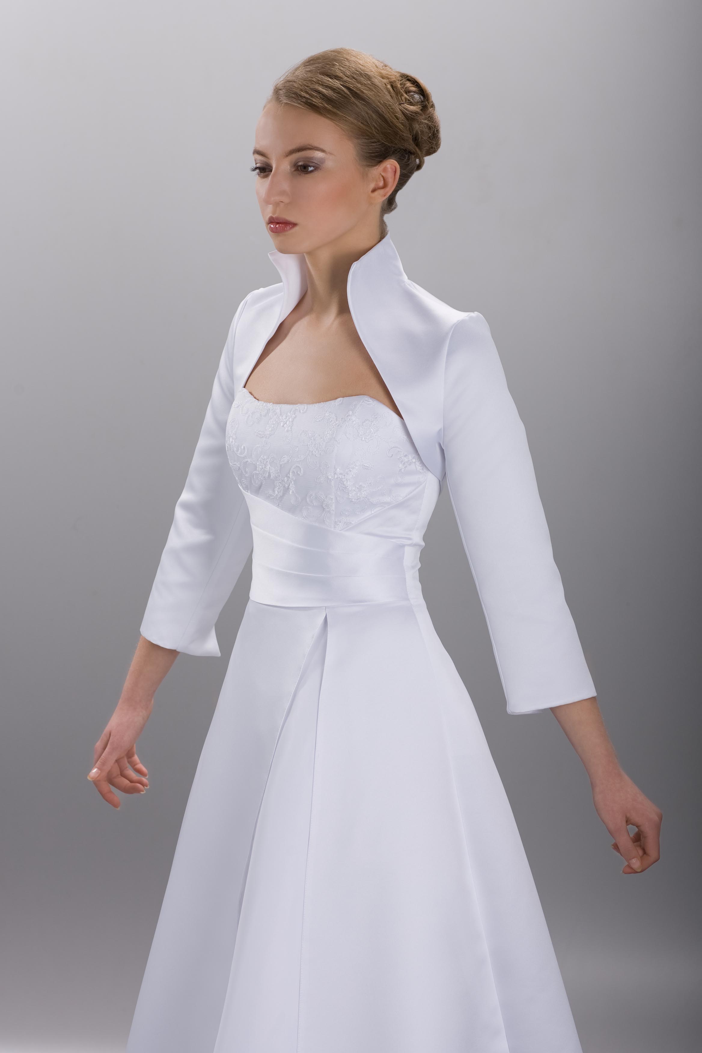 Boléro avec 3/4 manches et col ras de cou. Matériel: graisse satin Disponible en blanc et ivoire. Taille : S,M, L, XL.