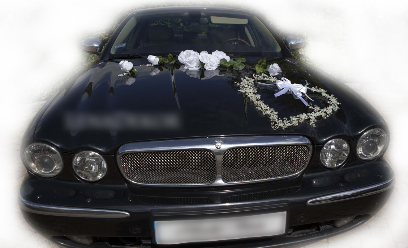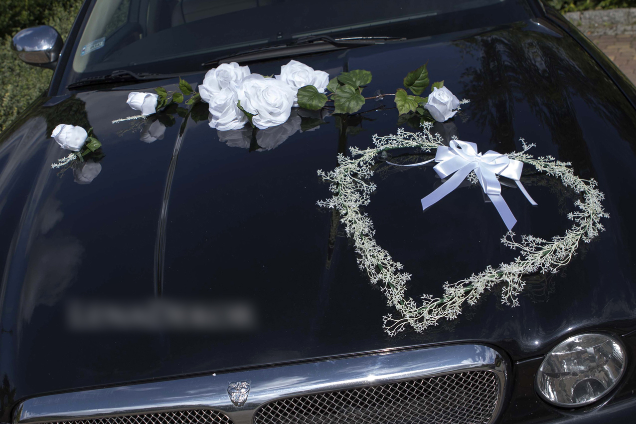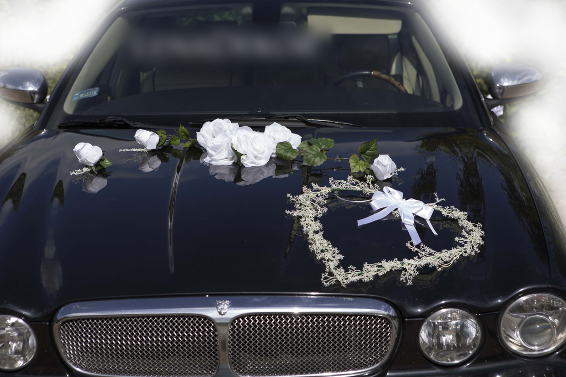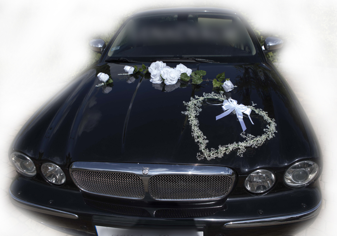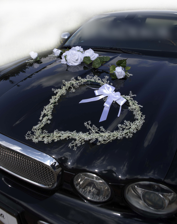 La décoration de voiture Princess est une élégante composition en blanc, réalisée avec des roses et des inflorescences de gypsophile. Le tout est complété par un accessoire stylé sous la forme d'un grand cœur richement décoré de petites fleurs des deux côtés.