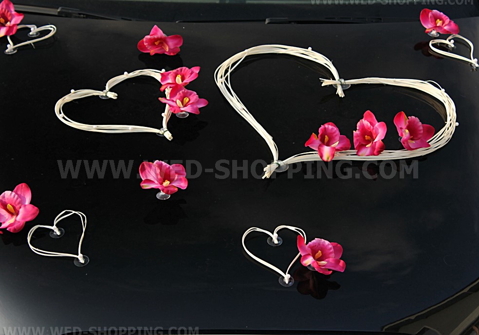 Plongez dans un univers de romantisme et de grâce avec notre magnifique décoration de voiture de mariage ornée d'orchidées rose foncé et de cœurs. Laissez-vous séduire par cet ensemble exclusif, composé de 3 grands cœurs scintillants avec des perles et des ventouses, de 11 petits cœurs délicats, et de 24 orchidées féeriques pour une touche de sophistication inégalée.