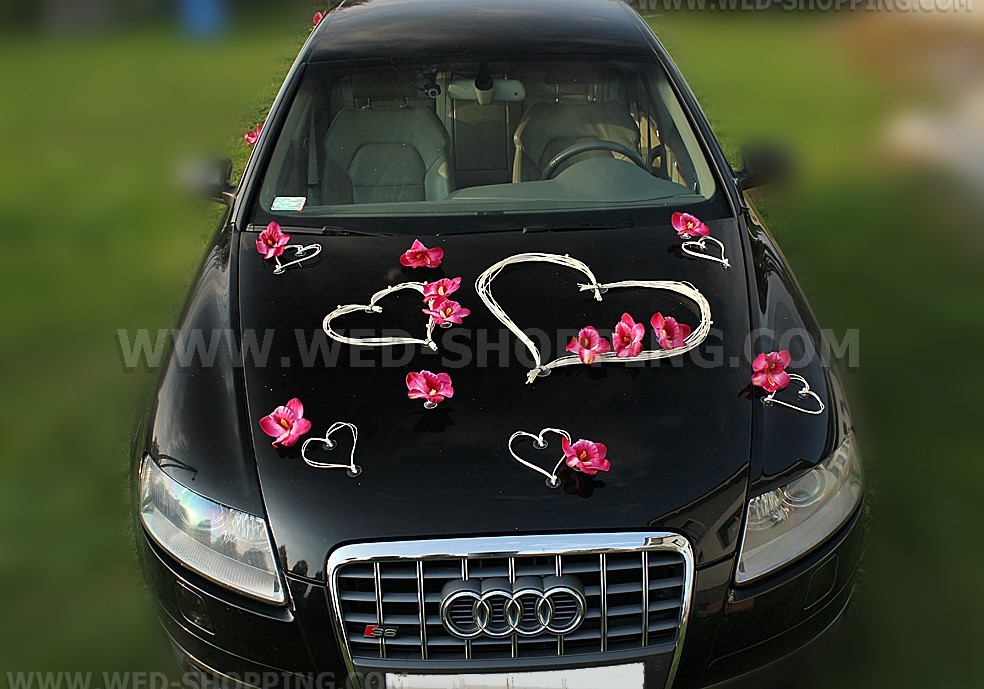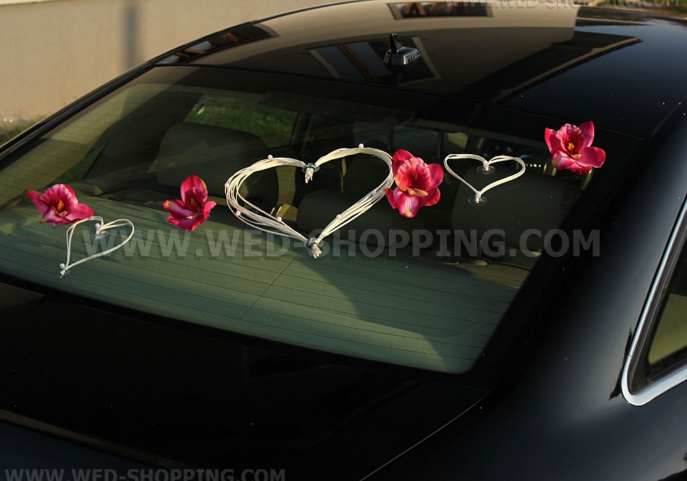 Décoration de mariage exclusif sur la voiture Ensemble: 3 grands coeurs avec des perles (avec ventouses) 11 petits coeurs avec des perles (avec ventouses) 24 fleurs - orchidées(avec ventouses) Coffre fort dans la décoration de la peinture automobile. Facile à installer. Composition très élégante.