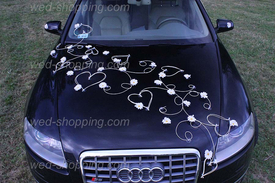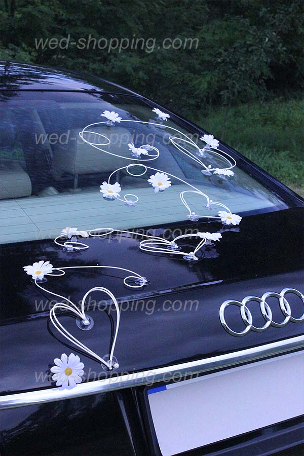 Imaginez-vous conduisant vers le lieu de votre mariage, entouré(e) de magnifiques marguerites blanches artificielles. Chaque détail de votre voiture est soigneusement décoré avec amour: 28 marguerites à l'avant, 12 sur les côtés (3 sur chaque porte) et 10 à l'arrière. Les marguerites sont d'un blanc éclatant, symbolisant la pureté et l'innocence de votre journée spéciale.