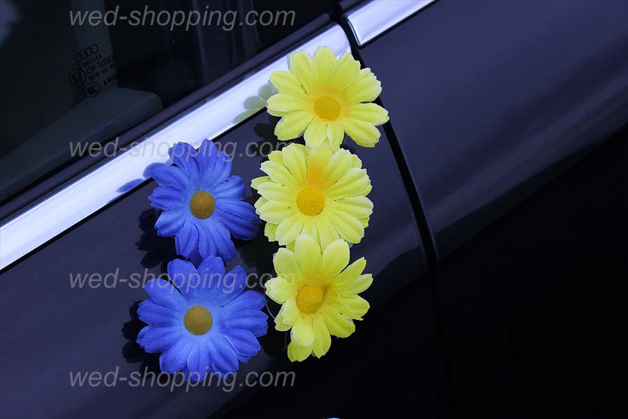 Entrez dans le monde féérique du mariage avec notre magnifique décoration de voiture marguerites jaune-bleu. Imaginez-vous conduisant vers votre grand jour, entouré de 28 marguerites scintillantes sur le devant de votre voiture, accompagnées de 12 marguerites de chaque côté et 10 à l'arrière. Un ensemble de décoration élégant et unique, monté sur des ventouses sûres pour la peinture de votre véhicule.