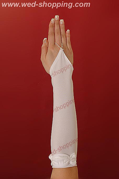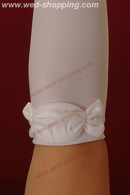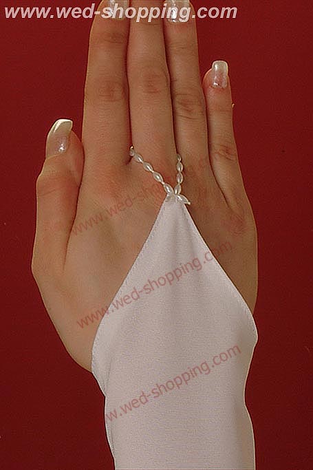 Gants courts avec rabat en ruban, parées d’une petite perle ou d’une petite fleur. Modèle qui montre les doigts. Matière : spandex brillant. Disponibles en blanc et ivoire. Taille unique