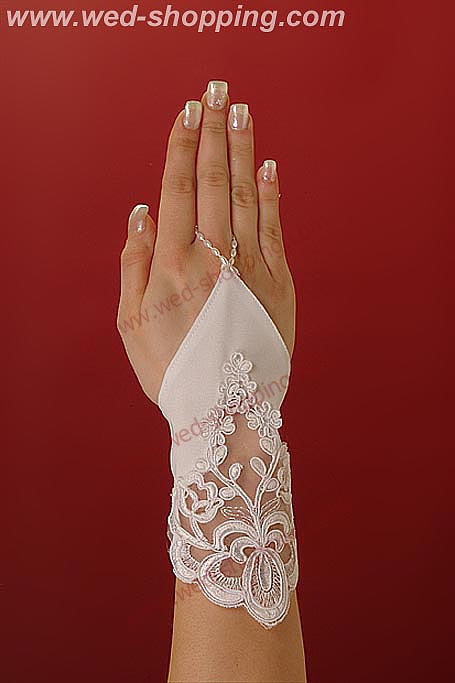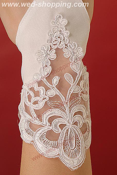 Gants courts, dégagent les doigts, avec un ornement en maille sur le poignet. Faits en spandex en satin. Disponibles en blanc et ivoire.