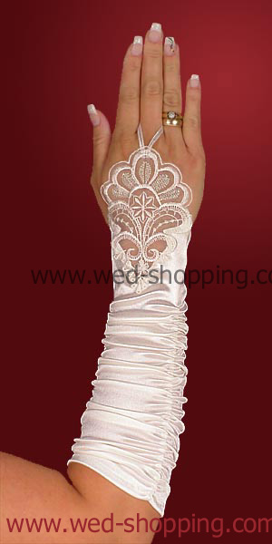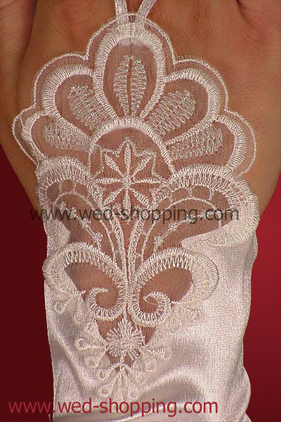 Gants sublimes pour la Mariée. Décoration remarquable sur la main ainsi que la draperie rendent ce modèle très chic. Faits en satin extensible de haute qualité.