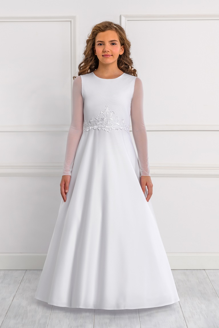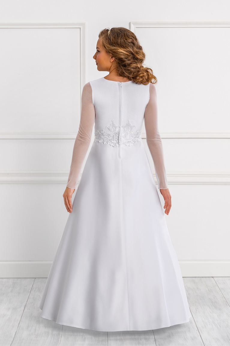 Robe cérémonie en satin avec dentelle et manches longues en tulle extensible.