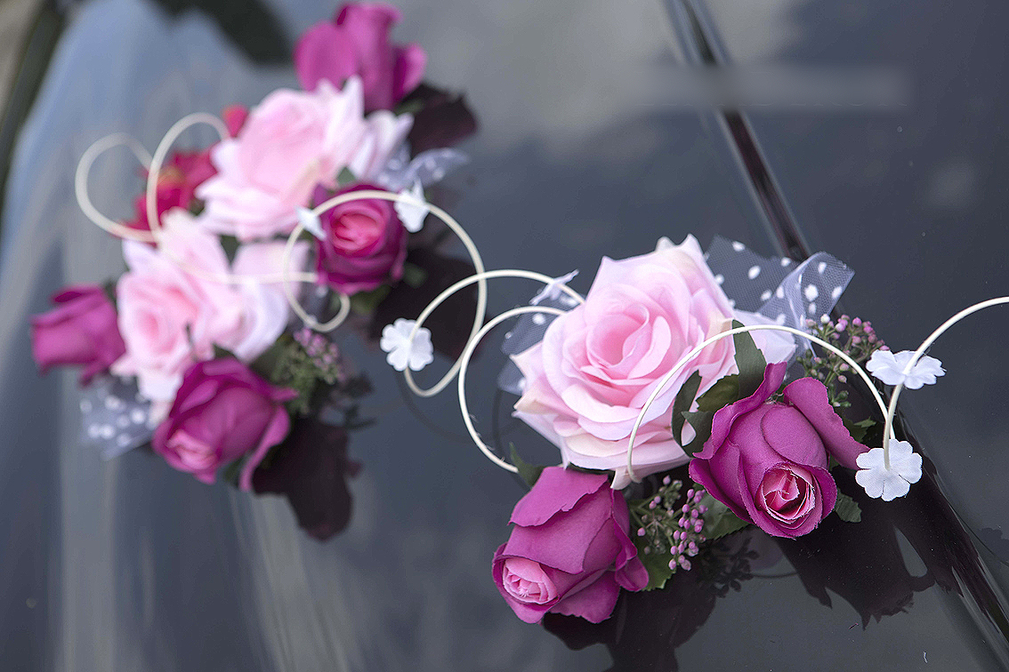 La décoration Rose Élégance est une composition réalisée avec des roses artificielles dans des tons rose clair et foncé, enrichie d'accents de tulle délicat à pois. Le kit Rose Élégance comprend un cœur en perles mousse douces de couleur rose poudré, plusieurs petits arrangements floraux individuels et un "ressort" en rotin orné de petites fleurs blanches. Polyvalente et facile à adapter à n'importe quelle voiture, la décoration Rose Élégance est l'accessoire parfait pour sublimer votre mariage.