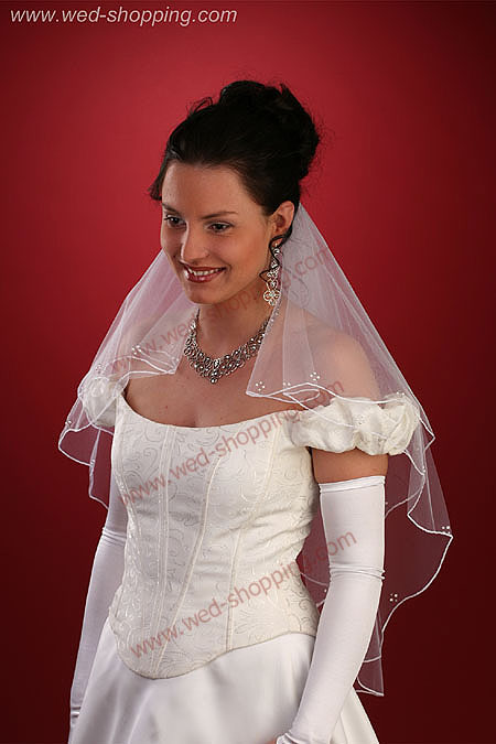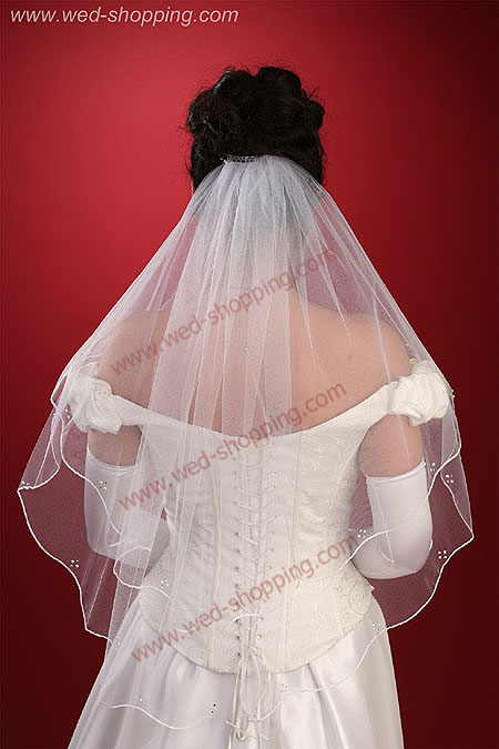 Longueur : 86/60 cm, largeur : 1,4 m, ovale, une alliance fine de 64 strass Swarovski et 64 perles Swarovski. Prix du voile sans tiare.
