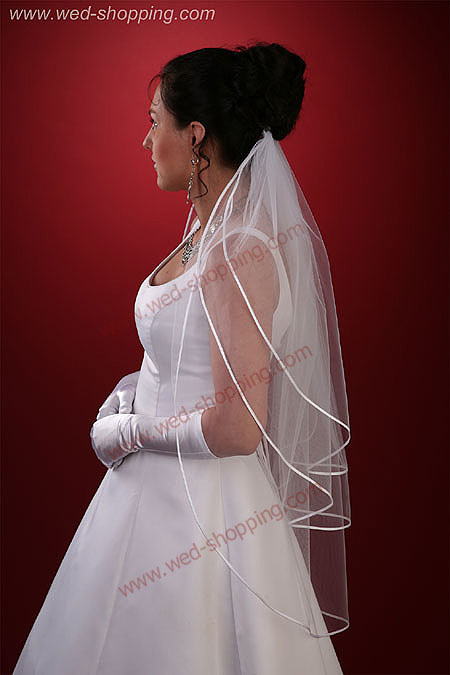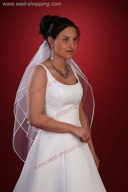 Voile trois couches, largeur : 140 cm, bordure en ruban. Longueur des couches : 90, 60 et 50 cm. Pincé par un peigne. Disponible en blanc et crème.